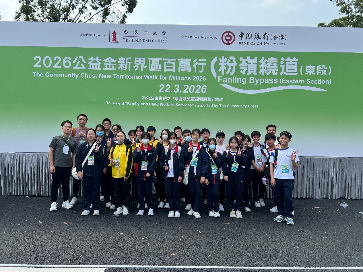 是次百萬行由中國銀行(香港)全力支持,所籌得的善款不會扣除任何開支,全數資助24間提供「家庭及兒童福利服務」的社會福利會員機構,協助有需要家庭,鼓勵成員間建立互愛互勉的緊密關係,預防及處理個人或家庭問題,並針對家庭無法解決的需要,提供輔助服務。本校校長、老師、學生一行二十餘人,一同在粉嶺繞道留下慈善的足跡,為社會出一分力。