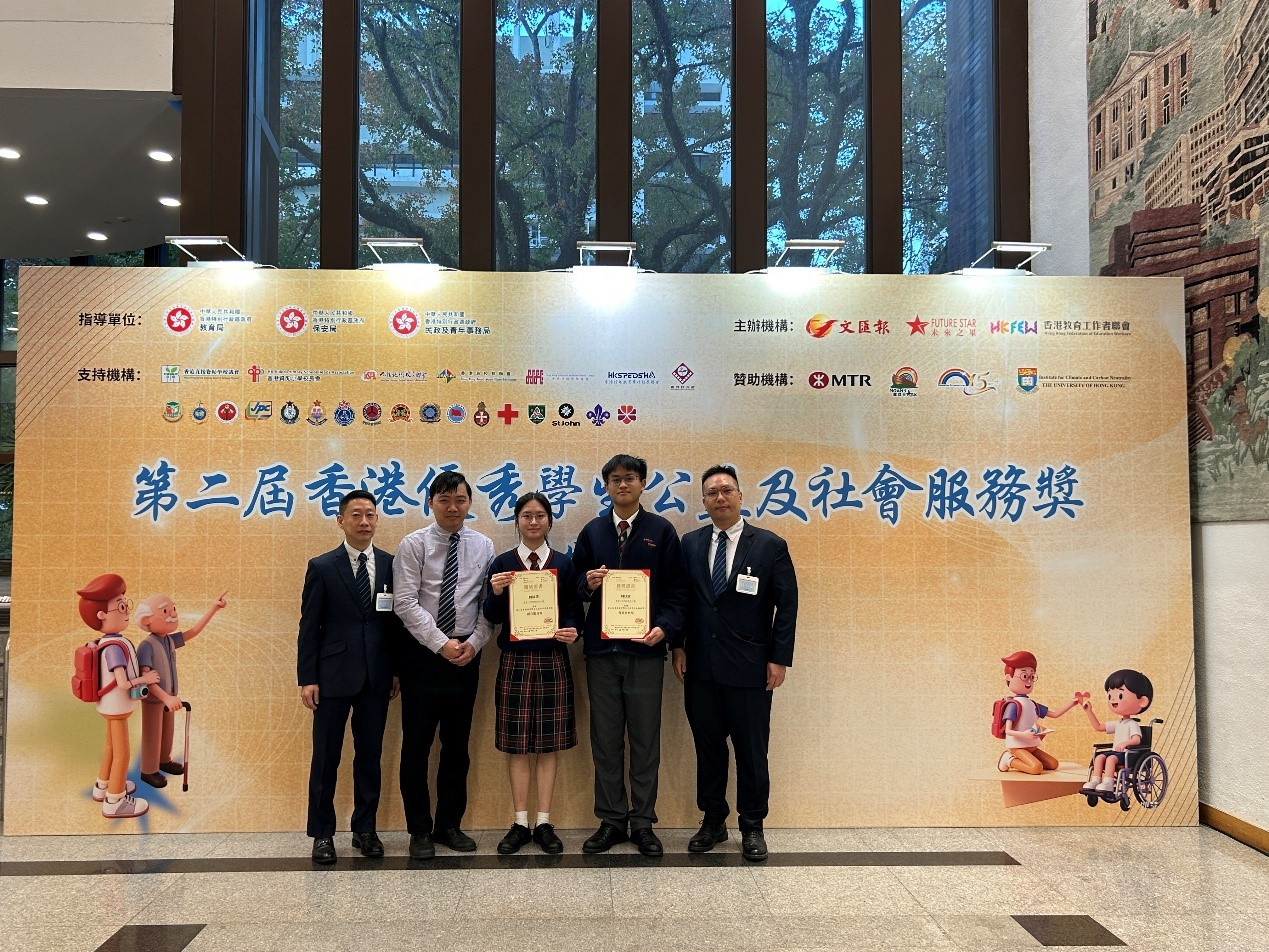 恭賀5B周汶波同學於第二屆香港優秀學生公益及社會服務獎評選中獲得「優異服務獎」;5A彭旭同學及5B何沅芝同學獲得「優良服務獎」,肯定三位同學對學校,以至社會的服務和貢獻。
